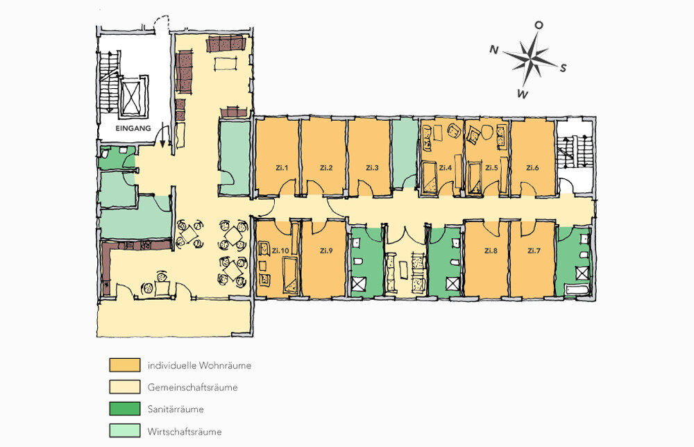 Die ca. 387 m² große Wohnung verfügt über zehn Einzelzimmer von jeweils ca. 15 m². Am Eingang der Wohnung befindet sich der große Wohn- und Essbereich mit der angrenzenden, offenen Küche. Von hier aus kann der große Wintergarten barrierefrei betreten werden. Alle gemeinsam genutzten Räume sind mit Möbeln und persönlichen Gegenständen der Bewohner eingerichtet. Die vier Sanitärräume entsprechen mit rutschfesten Bodenfliesen, Haltegriffen und ausreichend Bewegungsfreiraum den besonderen Bedürfnissen pflegebedürftiger Menschen. Jeder Bewohner hat ein eigenes Zimmer, das er mit seinen eigenen Möbeln individuell einrichtet und nach seinen Vorstellungen gestalten kann. Jedes Zimmer verfügt über einen Fernsehanschluss und ist abschließbar.